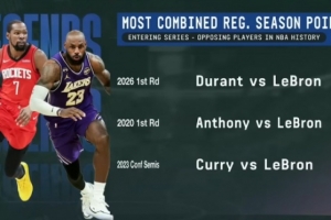 超詹库&詹瓜!詹杜生涯合计76037分 刷新系列赛交手双方得分纪录
