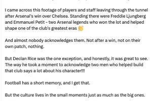 几乎没人注意到他们。赢球之后不会,在他们自己的地盘上也不会,什么都不会。但赖斯是个例外,说实话,这真令人欣慰。他特意停下来与两位为俱乐部发展做出贡献的人打招呼,这充分展现了他的品格!