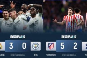 其中皇马送给曼城3-0的惨败,马竞送给热刺5-2的惨败,巴萨则是客场1-1平纽卡。目前三队晋级欧冠8强的概率都高于对手。