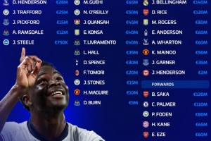 贝林厄姆(1.4亿欧)、赖斯(1.2亿欧)、罗杰斯(8000万欧)、埃利奥特·安德森(6000万欧)、亚当·沃顿(6000万欧)、梅努(5000万欧)、詹姆斯·加纳(3500万欧)、乔丹·亨德森(200万欧)