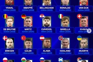 欧足联旗下各队历史身价最高球员:亚马尔、哈兰德、姆巴佩2亿欧