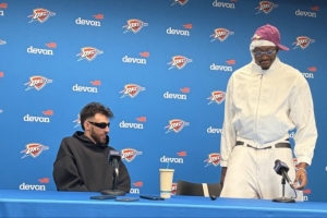 赛后,雷霆球员杰伦·威廉姆斯和霍姆格伦出席了新闻发布会。两人着装配色完全相反,杰伦威调侃道:“全黑和全白,就像阴和阳。”