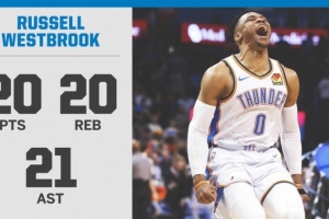 至此,威少成为NBA上第二位单场比赛打出20+20+20超级三双的球员,第一位是1968年2月4日的张伯伦(22分25篮板21助攻)。
