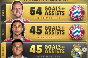 体育资讯4月8日讯 数据网站Score90盘点了本赛季五大联赛球员在各项赛事总参与进球榜(进球+助攻),前五中拜仁占据三席,具体如下: